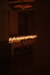 La recepción fue completamente iluminada por velas. Cientos de puntos de luz cálida crearon una atmósfera Ãntima, envolvente y romántica. La ausencia de flores se mantuvo como parte del concepto, reforzando la estética minimalista y permitiendo que la luz fuera la verdadera protagonista de la noche. El resultado fue una cena elegante, sobria y profundamente especial.